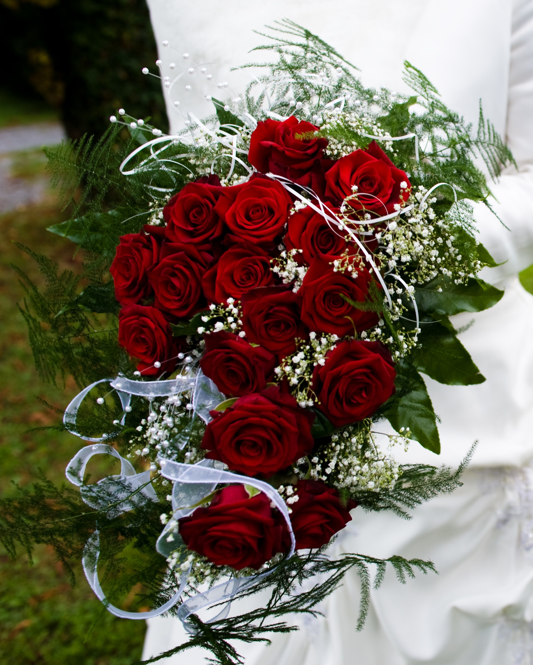 Skoraj eno uro smo kombinirali in oblikovali ideje za šopek, naprsne šopke, aranžmajčke na glavni mizi in kaj bo na avtu. Težko si predstavljam, kaj je za ustvarjalno cvetličarko bolj naporno… stranka, ki točno ve kaj hoče, ali stranka, ki ima le osnovno idejo in se prepusti toku? Vedela sem, da hočem vrtnice, da šopek ne sme biti premajhen ali prevelik in predvsem, da z njega ne sme bingljati cel kup priveskov! Zdaj se pa znajdi 😛 Ah ja, ne pozabimo na »kopijo« šopka, ki je morala biti karseda podobna, le malo manjša in bolj pripravna za metanje. Ko sem na »veliki dan« videla šopek, sem bila več kot zadovoljna!